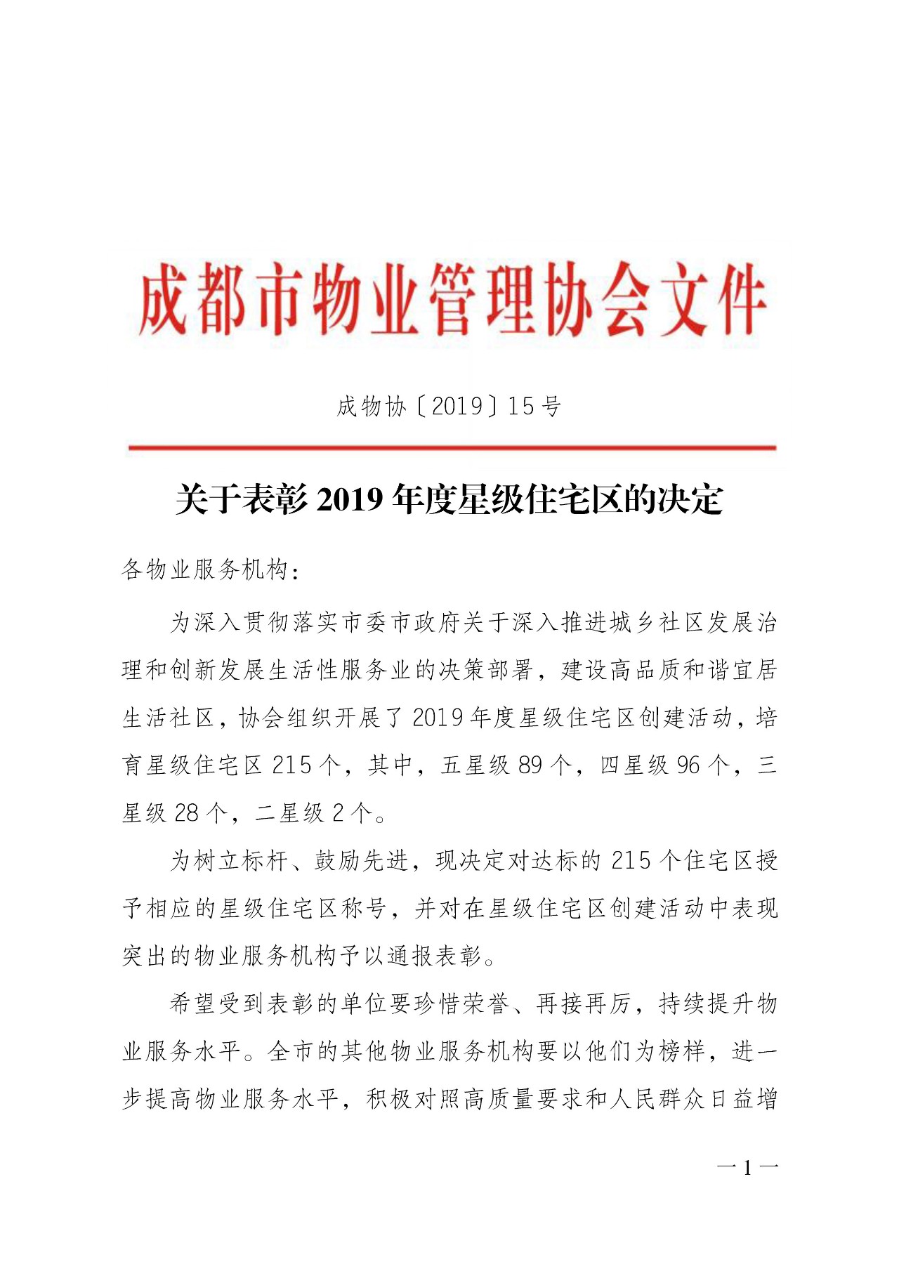 成都市物業(yè)管理協(xié)會(huì)組織開(kāi)展了2019年度星級(jí)住宅區(qū)創(chuàng)建活動(dòng),培育星級(jí)住宅區(qū)215個(gè)。